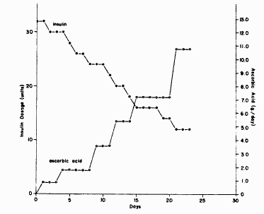 In order to examine the hypoglycemic effect of ascorbic acid, progressively increasing amounts of ascorbic acid were ingested hourly from 7:00 AM to 1:00 AM. Control of the diabetes was maintained by reducing the daily insulin dosage in response to hypoglycemic reactions, and by increasing ascorbic acid consumption when glycosuria developed. In this manner a portion of the daily insulin dosage was gradually substituted by ascorbic acid.