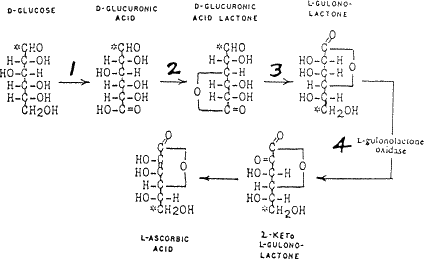In 1912 the vitamin hypothesis was postulated (Funk8), part of which stated that scurvy was a deficiency disease caused by a lack of an unknown water-soluble substance, called Vitamin C, in the diet. Twenty ears later in 1932 (Svirbely and Szent-Györgyi ), it was demonstrated that ascorbic acid was identical with Vitamin C. Burns10 in 1959 Showed that the basic biochemical lesion in the few mammals susceptible to scurvy was due to their inability to produce the active enzyme, L-gulonolactone oxidase, involved in the in the mammalian conversion of blood glucose to ascorbic acid, in their livers. This synthesis, involving four enzymes, is illustrated in Fig 2. Man has the first three enzymes in his liver but it is the missing fourth enzyme, which completely blocks the liver production of ascorbic acid.