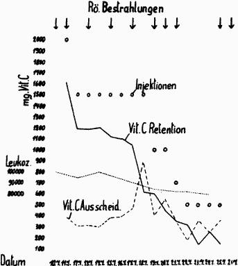 Es handelt sich bei R. um eine fortgeschrittene myeloische Leukämie, die gesamte Vitamin C-Retention betrug 1840 mg. Bei B. handelt es sich um eine mittelschwere Erkrankung, die durch die Behandlung so weit gebessert wurde, daß die Kranke ihre Arbeit als Hausfrau wieder verrichten konnte. Das Vitamin C-Defizit betrug 1470 mg. Diese Vitamin C-Mengen stellen gegenüber dem bei anderen Erkrankungen zu findenden „aktuellen Defizit“ keine besonders hohen Werte dar. Es gelang daher auch, das Defizit mit einigen Injektionen von Redoxon forte abzudecken. Durch die kombinierte Behandlung konnte in beiden Fällen eine befriedigende Besserung erreicht werden.