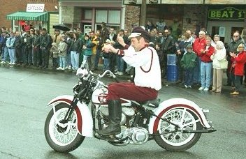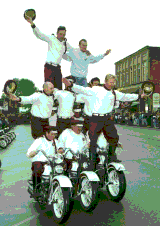 World-famous Seattle Cossacks Motorcycle Stunt Team parades down First Street. The Seattle Cossacks have been performing since 1938. |