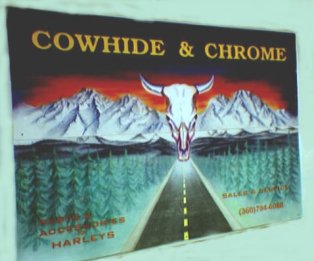 Here's a picture of Cowhide & Chrome, taken on a slow day when only one bike was parked out front. Truly, this is a rare sight. Click the picture for a larger view (20KB).