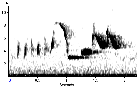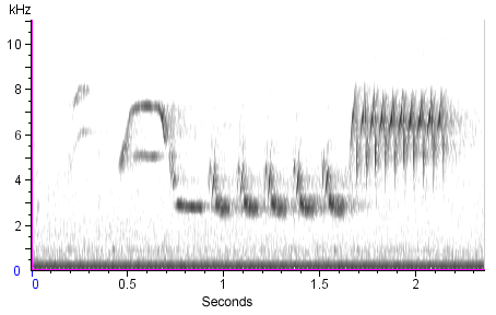 These wrens are fascinating in that an individual may sing 15 or more distinct songs. A wren will repeat one song for almost two minutes, then switch to the next song. These songs were all performed by a single bird, recorded in our backyard in May of 2005. Song #1 Play (.mp3, 15 seconds, 243Kb)