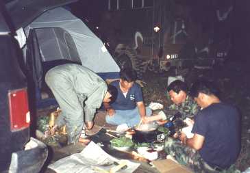 | What makes camping fun is the company you keep. We stopped at the top of mountain pass and made camp on the roadside by the light of the headlights. Have you ever heard of PoChon Makali? It is the best! | |