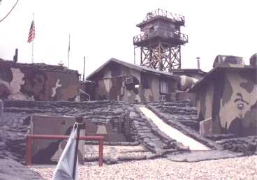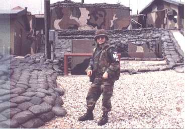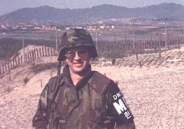 | I've spent some time in the PanMunJom area. Here I am posing as a Demilitarized Zone (DMZ) Military Police (MP). Behind me is what we call "propaganda village" in North Korea. | |