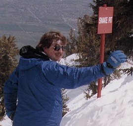 This is a picture of me at the Heavenly Valley ski area. I'm in the Snake Pit which is off the Mott Canyon chair on the Nevada side. It's quite steep and you can see a lot of Nevada from there. Here's a map. I think the Mott Canyon chair is simply the best chair at Heavenly. It's too bad there isn't more terrain which is worth skiing there as they have one of the best views of Lake Tahoe. If you are an intermediate skier though, Heavenly will do fine by you.