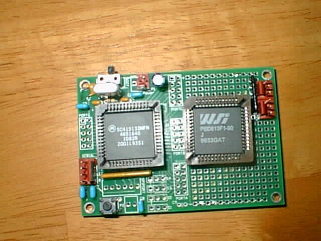 I've added a Waferscale psd813f1 device to my brand-new BOTBoard+, and the combination is dynamite! My system now contains exactly two chips, the 68hc11e1 and the psd813f1; no glue chips whatsoever. This tiny system sports 128KB of flash memory, 32KB of EEPROM, 2.5KB of static RAM, about 40 I/O lines of various types, and a wad of programmable logic that I can use to build shift registers, keypad scanners, and other cool subsystems.